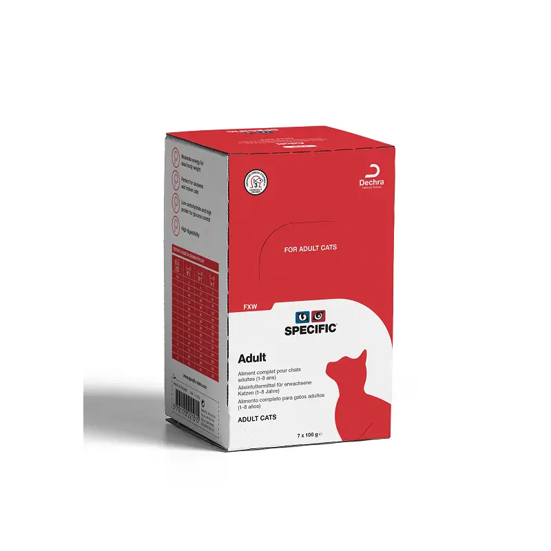 SPECIFIC Adult – pilnai subalansuotas ėdalas suaugusioms katėms. Dieta pilnai tenkina suaugusių kačių kasdienius poreikius ir palaiko gerą jų sveikatą.